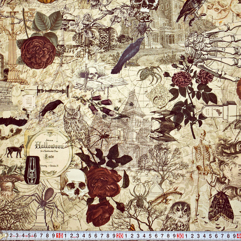 カボチャ、ドクロ、フクロウ、カラス、バラ ハロウィン・コラージュ ベージュ