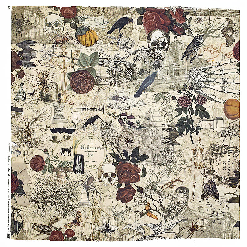 カボチャ、ドクロ、フクロウ、カラス、薔薇の花、蜘蛛、コウモリ、蛾、お化け屋敷、などの不気味なハロウィン・キャラクターがリアルに描かれています。