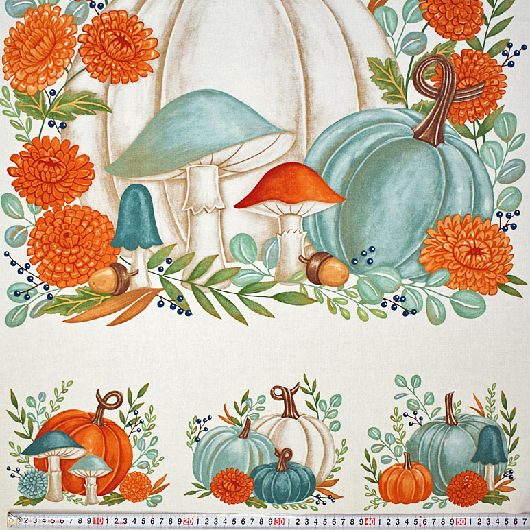 上のフクロウとカボチャの部分はタペストリー、下の3つのカボチャとキノコの部分はファブリック・パネルにと、分けて作っても楽しいです。