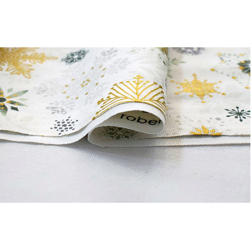 この生地は、白地にゴールドラメ、グリーン、グレーの雪の結晶柄が散りばめられ、さらにメタリックの輝きが加わることで、クラシカルで華やかなクリスマスらしさを演出します。