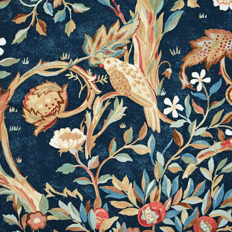 「Melsetter(メルセター)」は、スコットランド・オークニー諸島にある Melsetter House(メルセター・ハウス) の装飾を起源とする、物語性豊かなデザイン。果実のなる木(ザクロ)を中心に、鳥や花、葉が描かれたタペストリーのような構図が特徴です。
