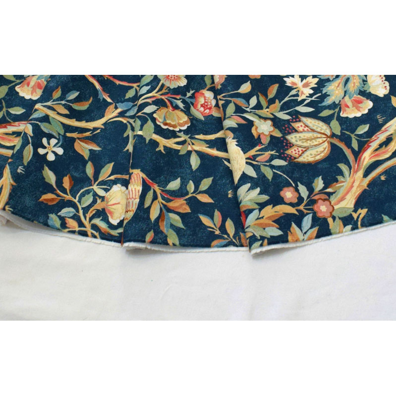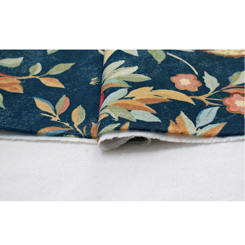 深みのあるインディゴ地に、生成りやグリーンを基調とした落ち着いた配色は、クラシックで静謐な印象。キルトやバッグ、クッション、小物制作はもちろん、インテリアにも映える大人向けの一柄です。