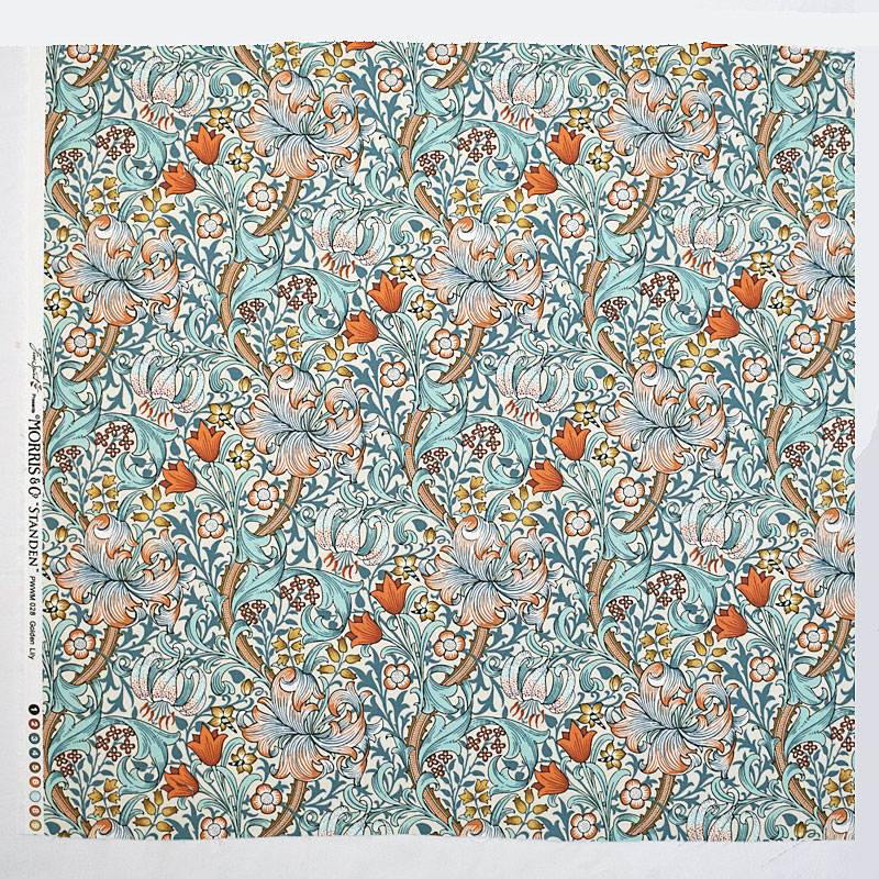 「Golden Lily(ゴールデン・リリー)」は、百合の花と力強く伸びる葉をモチーフにした、ウィリアム・モリスを代表する華やかな名作デザイン。動きのある曲線と密度の高い構成が、アーツ・アンド・クラフツの装飾美を存分に感じさせます。