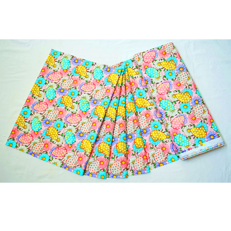 淡いピンクをベースに、小花が描かれた、ブルー、ゴールド、ピンク、淡いグリーンのカラフルなイースター・エッグとブルー、ピンク、パープルの花が散りばめられ、優しく華やかな印象に仕上がっています。