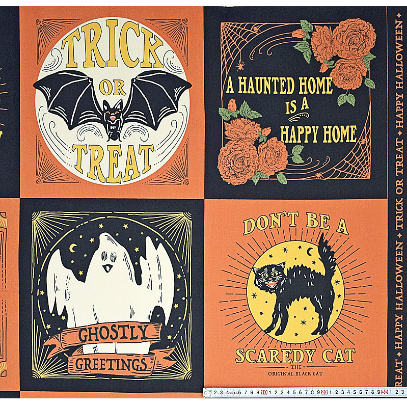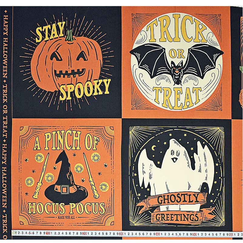 このままハロウィン・タペストリーにしても可愛いですし、パネルごとに切り離してクッションやトートバッグを作っっても楽しいです。