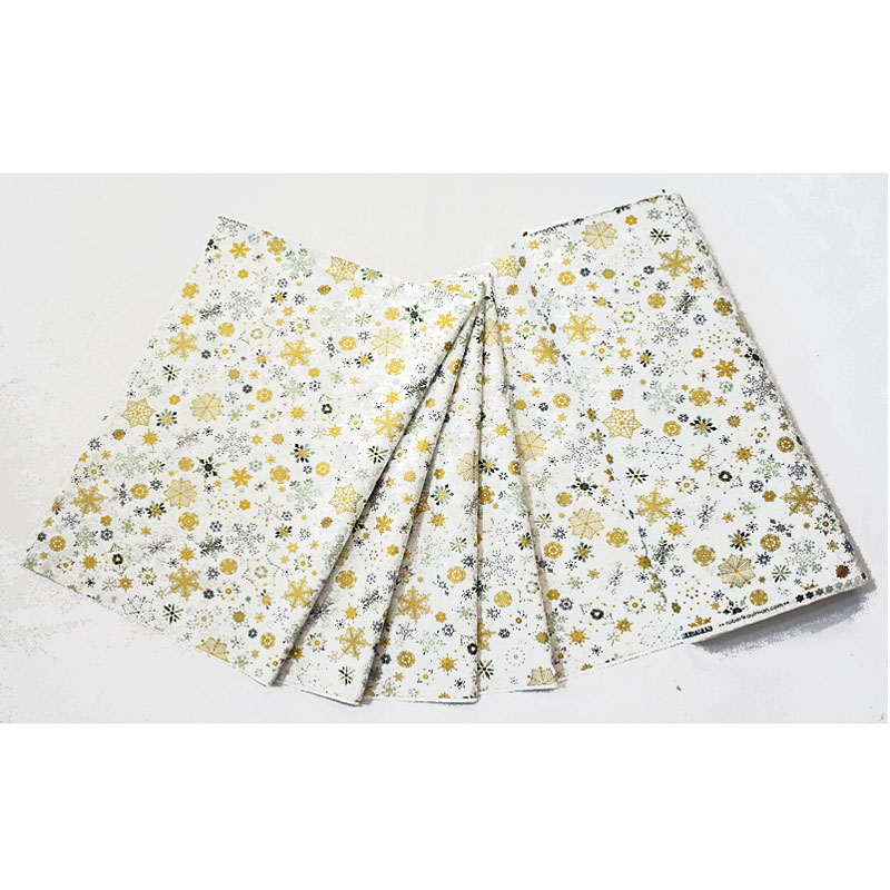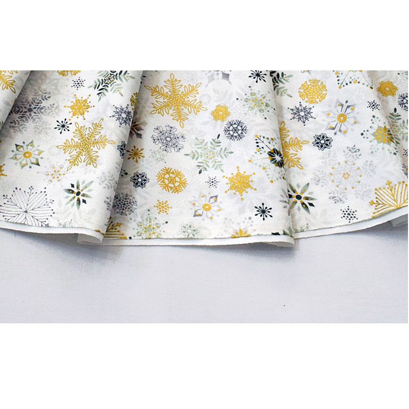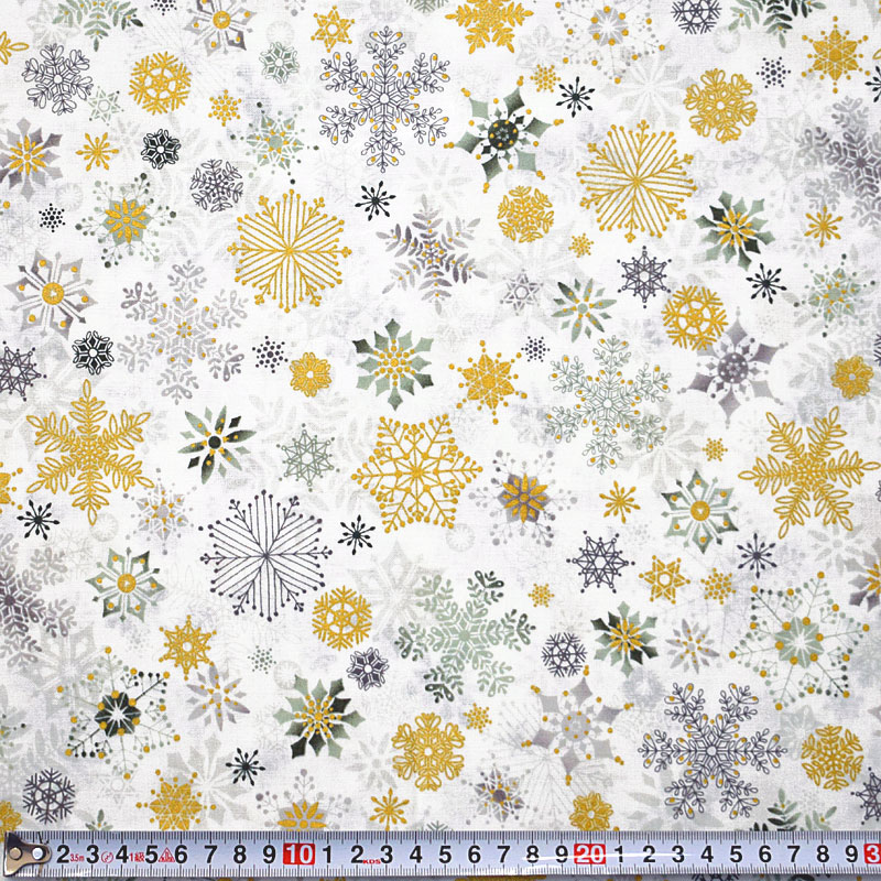 この生地は、白地にゴールドラメ、グリーン、グレーの雪の結晶柄が散りばめられ、さらにメタリックの輝きが加わることで、クラシカルで華やかなクリスマスらしさを演出します。