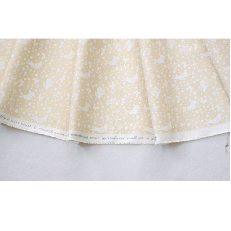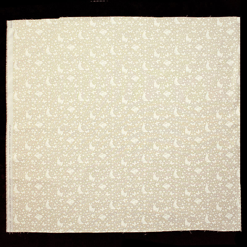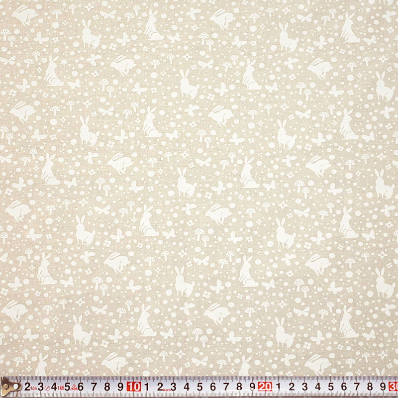 クリーム地に白でウサギ、蝶々、キノコ、お花、ドットを描いたデザインは、ナチュラルで繊細な雰囲気を持っていて、どんな作品にも合わせやすい万能ファブリックです。