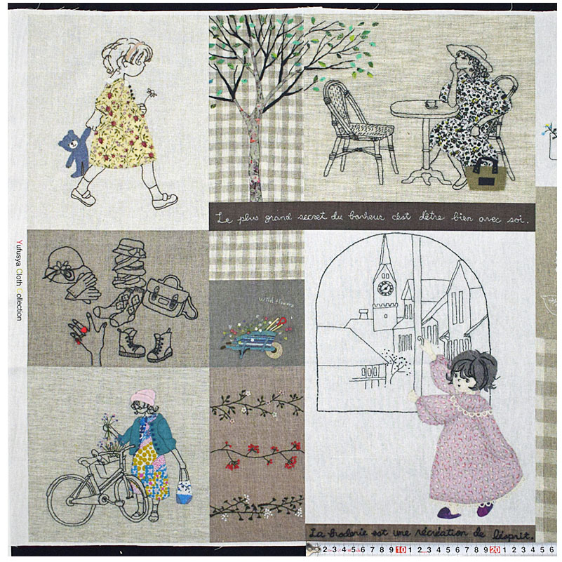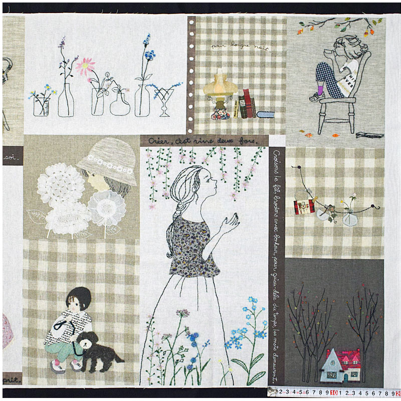 刺繍、アップリケ風の女の子 パネル/グレー・クリーム 110*58