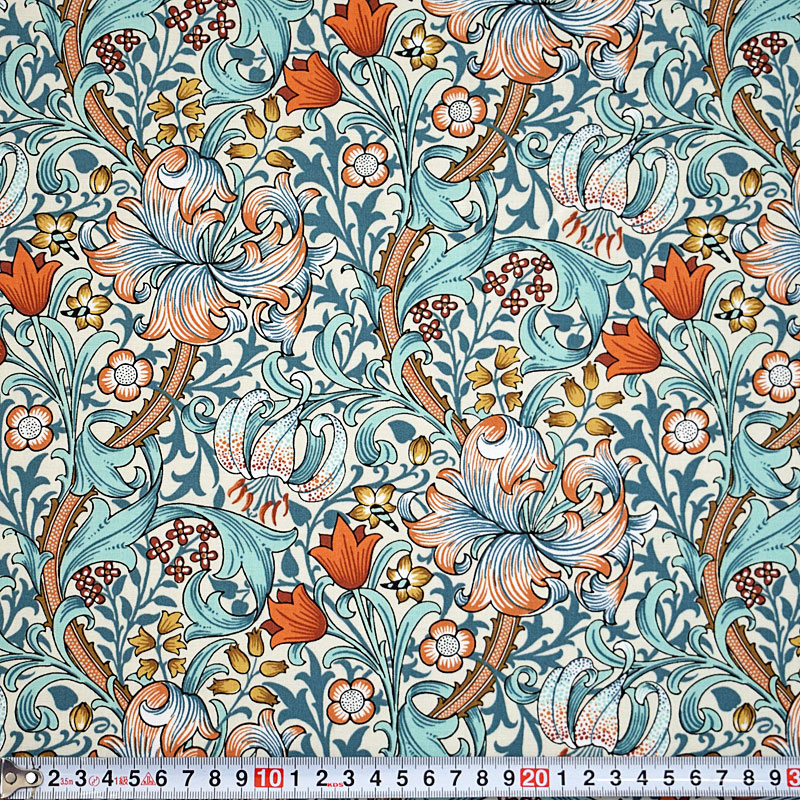 「Golden Lily(ゴールデン・リリー)」は、百合の花と力強く伸びる葉をモチーフにした、ウィリアム・モリスを代表する華やかな名作デザイン。動きのある曲線と密度の高い構成が、アーツ・アンド・クラフツの装飾美を存分に感じさせます。