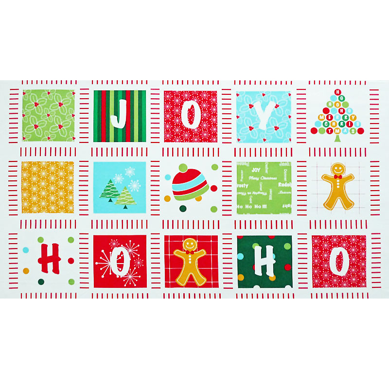 各パネルは明るい色使いで"J"、"O"、"Y"、"H"、"O"と言う文字やジンジャークッキー、クリスマスツリーなどを描いています。